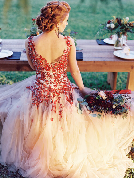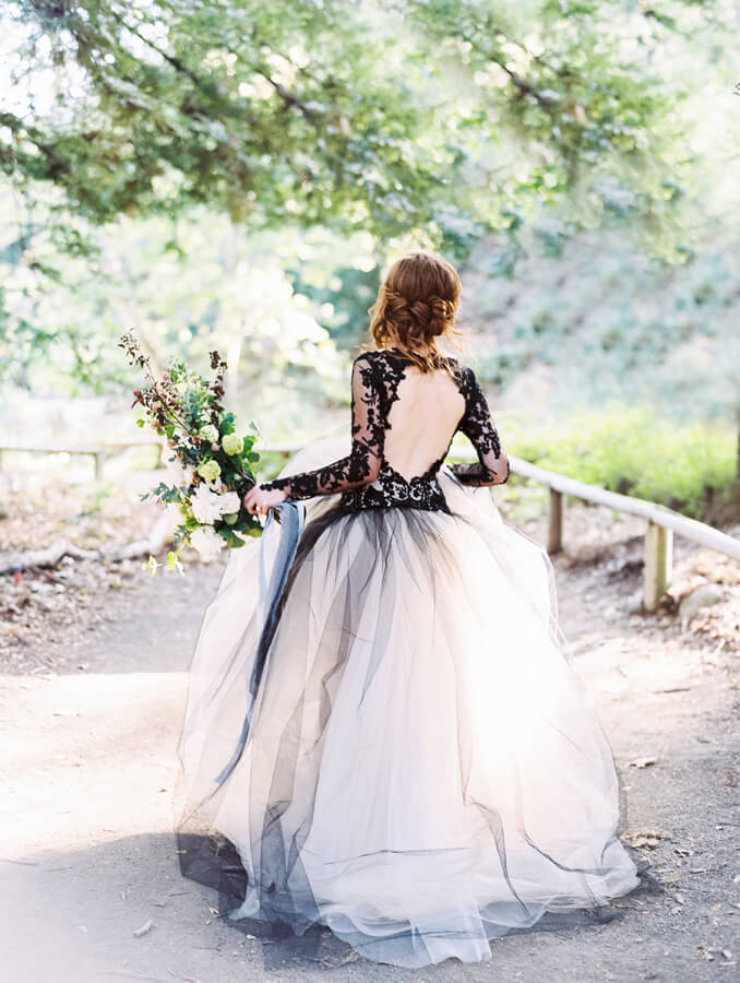 Si eres una novia atrevida puedes lanzarte a darle un toque original, divertido y sobre todo diferente con el que sorprender a todos tus invitados. Ya sabemos que el vestido de novia es uno de los secretos de la novia más personal, pero como hay vestidos para todos los gustos, os proponemos varias opciones. Si no te atreves con un vestido de novia naranja para tu boda en Halloween, quizás un vestido con tul negro pueda ir más contigo. Pero incluso si estas opciones son demasiado para ti, este vestido con encaje de hojas puede ser un poco más discreto pero mantiene el toque original, de otoño que puede encajar perfecto para una boda con cierta inspiración de Halloween.