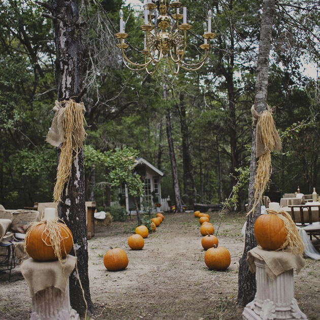 El primer paso si queremos darle un toque Halloween a nuestra boda pasa por la decoración. Es cierto que relacionamos la temática de Halloween con motivos un tanto tétricos que quizás desentonen un poco en una boda. Pero como alternativa podemos optar por basar la decoración con uno de los elementos imprescindible en cualquier celebración de Halloween como las calabazas. Como veis las calabazas pueden darnos un juego increíble a la hora de decorar espacios exteriores, como en estos caminos al altar delimitados por calabazas.